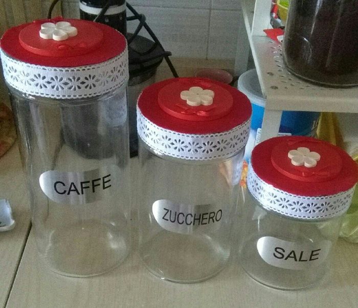 Ciao ragazze, avevo dei semplicissimi barattoli di vetro con tappo in metallo, assolutamente anonimi e ho modificato il tappo con un po' di fantasia. Come potrei modificare anche quelle brutte etichette "caffè", "zucchero" e "sale" con le stesse...