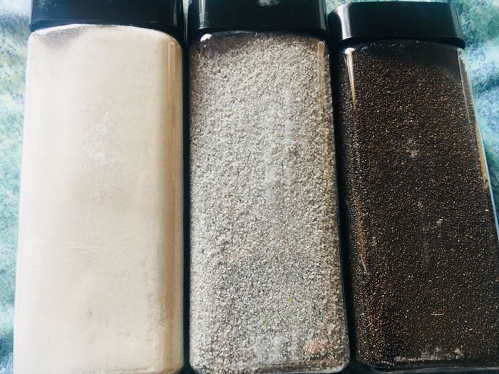 Ho un forte dubbio...abbiamo comprato le sabbie dei colori che secondo noi vanno bene (bianco avorio brillante, grigio argento luminoso e caffè a simboleggiare la base, la terra) ma la prima, mi accorgo che ha una consistenza più sottile delle altre...