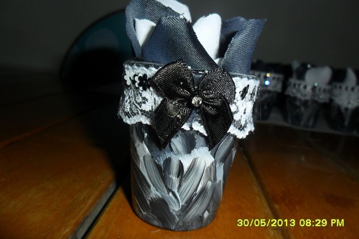 e anche questa è fatta vassetti di recupero in vetro: li ho decorati con del ricamo in cotone che ho incollato con colla vinilica diluita con acqua e rifinito con nastro rosso e rafia blu.... che ne dite? :$