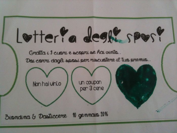 Ciao a tutte.. Ho finito i miei gratta e vinci.. I premi saranno dei regalini fatti da me, poco costosi e facili da realizzare, in modo che in pochissimi rimarranno senza premio Eccoli: E questo invece è il coupon di 3 cene.. Consiste solo in 3 cene...