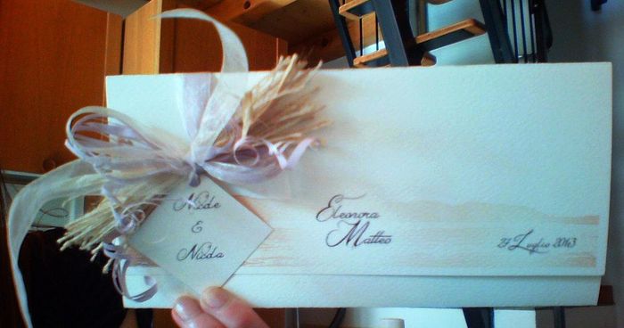Ecco qua le nostre partecipazioni.... Come vi avevo detto le ha progettate tutte il mio fm... Poi io le ho "confezionate" con ficchetti e quant'altro... Quelli nella foto siamo noi sul lago, dove abitiamo! Vi piacciono??? Mi dispiace che per adesso...