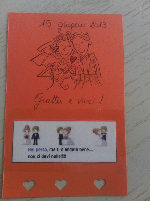 Ciao ragazze, ho realizzato ieri i gratta e vinci per il matrimonio!! L'idea è questa: dare un gratta e vinci a ciascun invitato, ma ovvimanete solo alcuni biglietti saranno i vincenti! Ecco le foto (qui ho messo solo i biglietti perdenti) Nel gratta...
