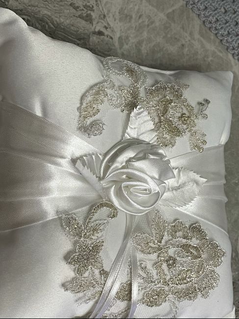 Ciao ragazze, Oggi ho ritirato le fedi e il cuscino in regalo. Sul cuscino vorrei applicare il pizzo del vestito che la sarta è riuscita a fornirmi . Vorrei eliminare xo le foglie attorno al fiore, che ne pensate?