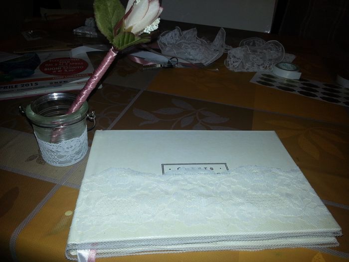 eccoli pronti il guestboook l ho comprato poi io gli ho aggiunto il pizzo, la penna l ho fatta io e il porta penna era un portacandela