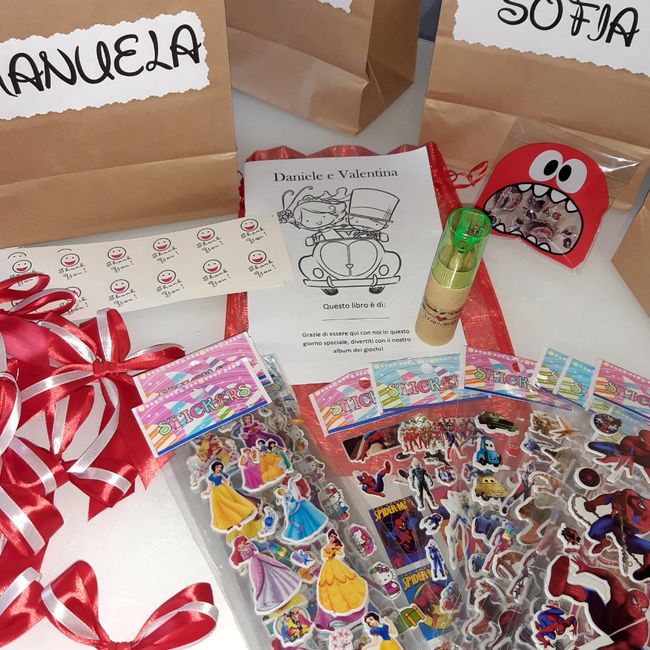 Ragazze chi di voi ha pensato anche ai bimbi? Io per ora le ho preparate così con un libricino da colorare fatto da me e matite colorate, a breve arriveranno anche bracciali che si illuminano e stampini con animaletti... poi pensavo di mettere lecca...