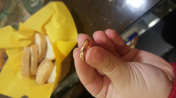 Ciao a tutte!! Oggi è arrivata la fede che ho ordinato come "campione" per provarla su di me e vedere come mi stava, e l'ho fatta vedere anche a fm. Che vi sembra? La misura è la mia, nemmeno la sento addosso! Pensavo di farla in oro rosa, ma...
