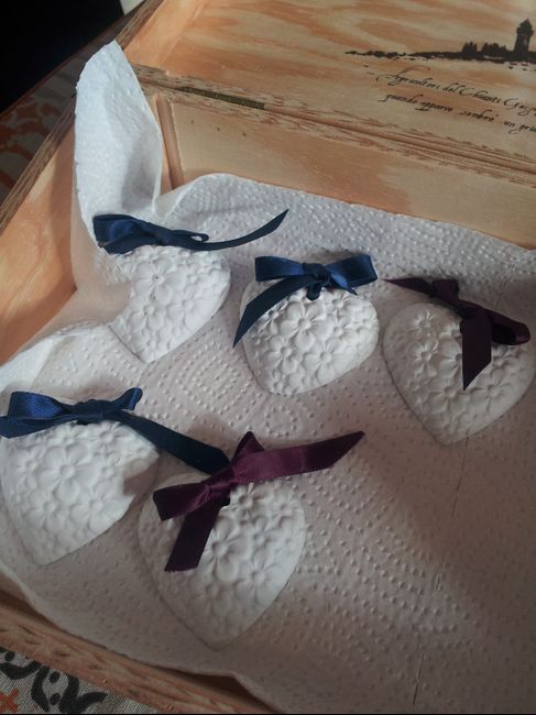 Eccoli.ho deciso di abbellirli cosi e poi metterli in un sacchettino di tulle e dietro il gesso scrivere i ns nomi e la data del matrimonio.