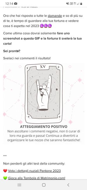 Ora che hai risposto a tutte le domande e so di più su di te, è tempo di guardare alla tua fortuna e vedere cosa ti aspetta nel 2023 🔮🔮🔮 Come ultima cosa dovrai solamente fare uno screenshot a questa GIF e la fortuna ti svelerà la tua carta! Sei...