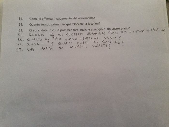 Voglio aprire questo topic per aiutare sulla scelta della location,le domande da fare sono molteplici: 1) quanto costa a persona? 2) il prezzo è incluso d'iva?3)la cucina è interna ?4) c'è un numero minimo di garantire di invitati ?5) c'è l'opzione...