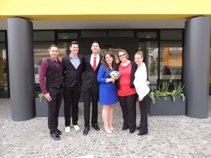Eccoci qui! Alla mia sinistra Kristina e Chantal! Alla destra di mio marito Luca, Riccardo e Patrick Voi avete una foto con i vostri testimoni? Postatela!