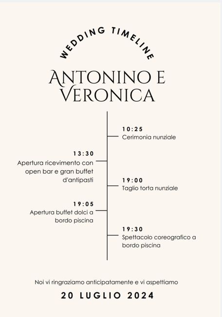 Buongiorno a tutti, ho preparato la famosa timeline: tanti sono a favore tanti sono contrari. Per me e' di fondamentale importanza che gli ospiti sappiano e conoscano, con largo anticipo, le tempistiche del matrimonio per diversi motivi: tanti...