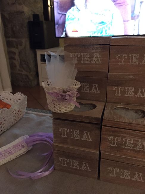 .....stasera finalmente ho iniziato ad assemblare le mie bomboniere!!!!!! * * Sara un bel lavoro.... Eccole qui in fase di lavorazione.... Scatoline porta the con allninterno tre tisane e un cestino fatto all uncinetto dalla mamma del mio fm, con...