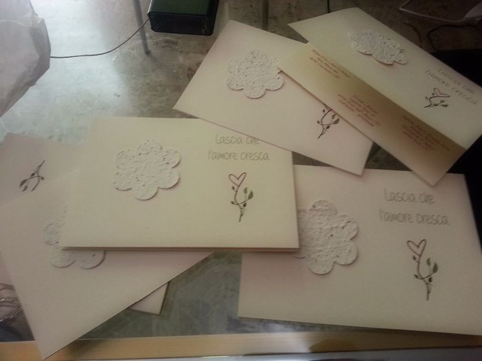 Ciao ragazze! Ho scelto le partecipazioni. Posso personalizzare la scritta esterna ma ho bisogno di una mano. Il fiorellino che vedete è composto da piccoli semi e, staccandolo, si può piantare per far crescere una bella piantina. Cosa potrei...