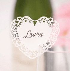 Vi piacciono questi segna posto? Sul tovagliolo avevamo intenzione di mettere un fiorellino fatto con pizzo di Cantù, mentre sui bicchieri avevo pensato di mettere questo cartoncino con scritto da una parte il nome dell'invitato e dall'altra parte...