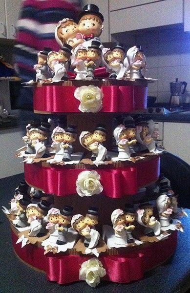 Ciao Sposine, che ne dite di quest'idea??? partendo dall'idea che non vorrei spendere troppo per le bomboniere, mi piaceva questa, scatoline con i confetti con sopra gli sposini. sempra una super torta. vi piace?? bomboniera