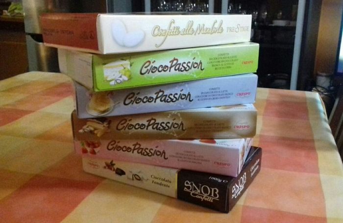 Ciao a tutte!! Stasera test confetti...ne abbiamo presi di sei tipi 1 kg per gusto, per ora!!! eccoli