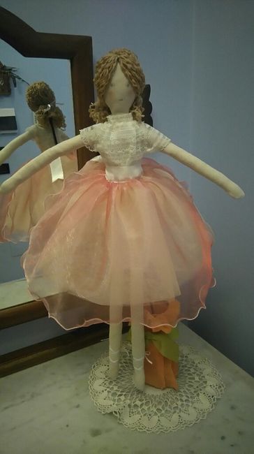 Buongiorno sposine Che ve ne pare?! Il viso è da perfezionare a seconda dei gusti, è completamente fatta a mano da una signora bravissima e i confetti verranno confezionati in sacchettini della stessa stoffa dei vestiti perché sono ballerine...