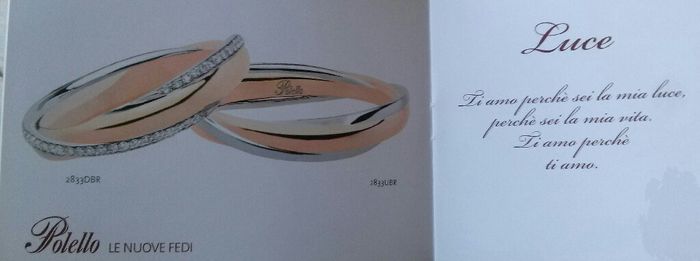 ciao a tutti volevo condividere con voi la mia gioia finalmente decise le fedi che portemo per sempre al dito,come le ho viste e stato amore allo stato puro,grazie anche a mio marito che mi a dato l ok nn ostaste il prezzo altissimo,