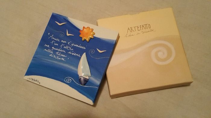 Ciao ragazze ecco le nostre bomboniere. Dato che volevamo qualcosa di diverso dalle solite bomboniere, abbiamo scelto questi quadretti realizzati a mano e personalizzati secondo i nostri gusti. Il tema del matrimonio è il mare ed i colori sono il...