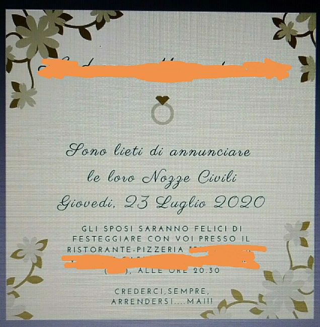 Brides buonasera!!!stasera ho creato su canva quest invito per il mio matrimonio civile dato che il religioso al 99% sarà spostato al 2021...sono molto soddisfatta di ciò che ho realizzato..secondo voi può andare???l unica problema è che non so come...