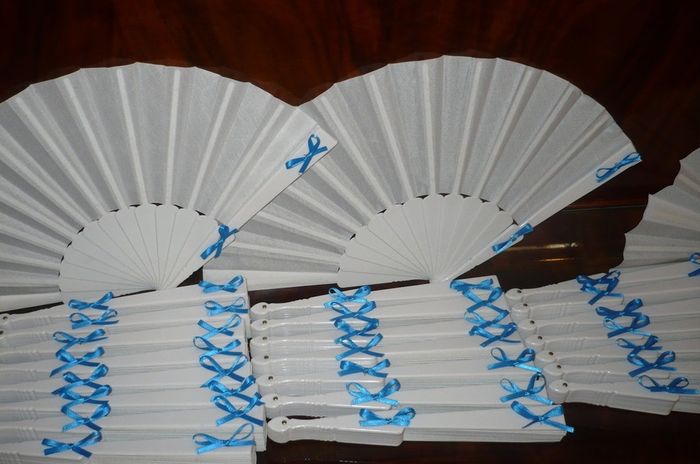 ho acquistato dei ventagli bianchi su ebay e volevo decorarli con dei nastrini di raso..poi vedendo le misure ho optato per degli strass blu che sarà il nostro colore..ora mi chiedevo in questi ventagli voi cosa aggiungereste? avete qualche foto?...