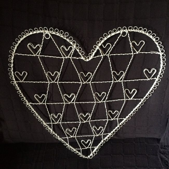 ho trovato questo cuore In ferro battuto come base per il tableau. Ogni cuoricino interno è doppio per contenere i tavoli (e le foto quando tornerá a casa). Lo decoreró con fiocchi arancioni e verdi (colore del matromonio). Non c'entra molto col tema...