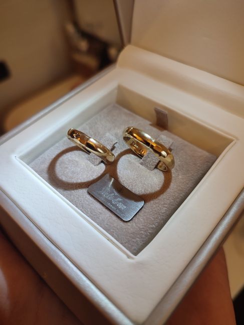 Ecco le nostre fedi, la abbiamo create e disegnate insieme all'orafo. La mia è tutta liscia con la parte centrale martellata e al centro un diamante Brown, quella del mio futuro marito il contrario cioè tutta martellata e al centro liscia come la...