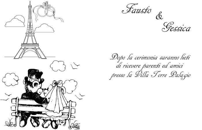 Questa sarà la nostra partecipazione creata tutta da me!!!!Le immagini significano il posto e il momento in cui lui mi ha fatto la proposta di matrimonio e cioè sotto la Torre Eiffel a Parigi in una panchina e gli orsacchiotti siamo noi e in più ci...