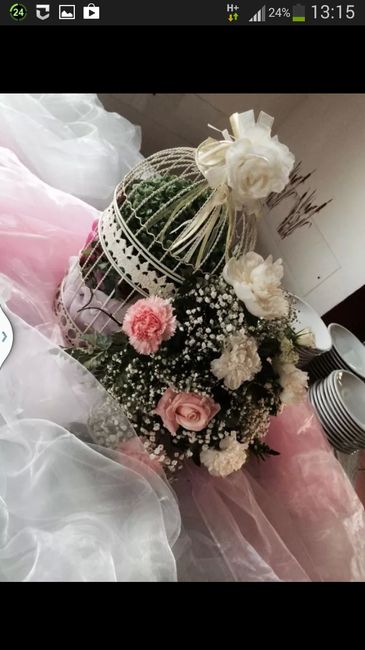 Oggi ho provato le idee che avevo in testa e ovviamente sono materiali che avevo in casa e non ho la mano di chi lo fa di mestiere ma i centrotavola e il tavolo della canfettata prende vita con nuvole di tulle bianco e rosa