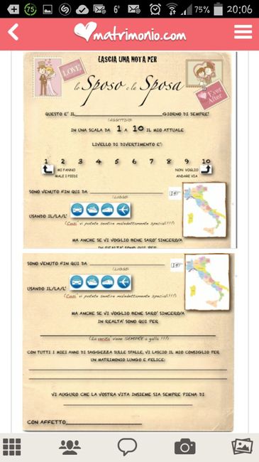 Ciao a tutte....a tutti i matrimoni a cui ho partecipato ho notato che la dedica sul guest book è vista dagli invitati come un obbligo.....io ero sempre l'addetta a farlo girare tra i tavoli.....e delle volte rimaneva delle ore sul tavolo perchè...