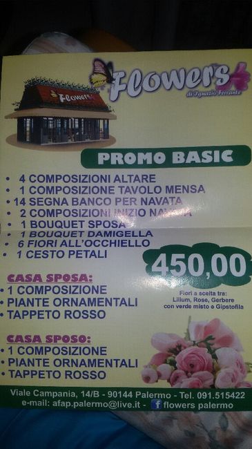 ciao a tutte :-) ho bisogno del vostro parere. Ieri sono andata da un fioraio di cui avevo sentito parlare benissimo nel mio paese , per farmi fare un preventivo. MI ha fatto un prezzo totale di 780€ dov è compreso : addobbo totale chiesa, 1 bouquet...