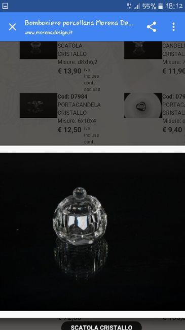 Buonasera sposine mie!stasera finalmente abbiamo scelto le bomboniere!!!amore a prima vista..un porta bon bon di cristallo della linea Morena..sono incluse anche le partecipazioni e i bigliettini bomboniera vi allego la foto dal catalogo e la...