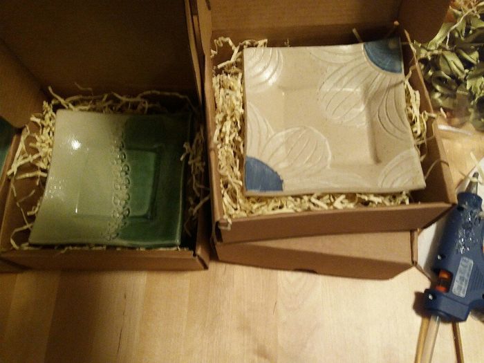 3202 giorni faSono piattini/svuotatasche in ceramica a forma di foglia...sono molto belli e funzionali come piattino per una tazza da caffè...vi piacciono?Confezioni e ciuffetti di confetti sempre fatto da me 😉