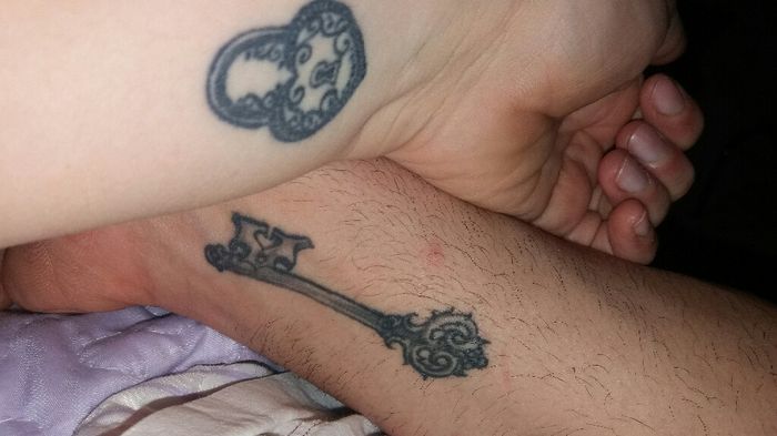 Eccola qua. L'ultima sua pazzia prematrimoniale.Mi raccontava sempre che a 18 anni si era tatuato quel lucchetto per il suo futuro e che doveva essere finito.Ieri con tanta sorpresa, mi manda questa foto. Ora si che è completo. Lo amo tanto questo...