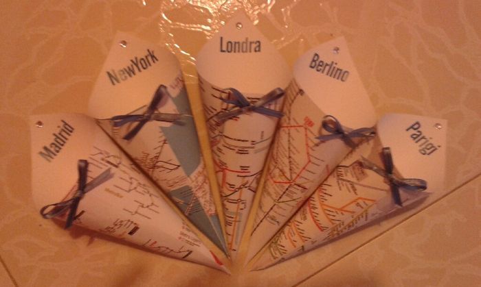 Salve sposine, un po' di tempo fa vi avevo mostrato una prima prova dei miei coni a tema viaggio...ebbene, oggi vi mostro quelli definitivi che metteremo fuori la chiesa. Sn le mappe metro di 5 citta' da noi visitate. Sn super soddisfatta!!! Vi...