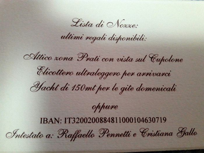 Ciao a tutte sposine.Sono al limite con la scelta di partrcipazioni e il dubbio che mi assilla e come informare gli invitati sul tipo di preferenza del regalo.Non abbiamo una lista di nozze perché gia viviamo insieme e abbiamo tutto e vorrei evitare...