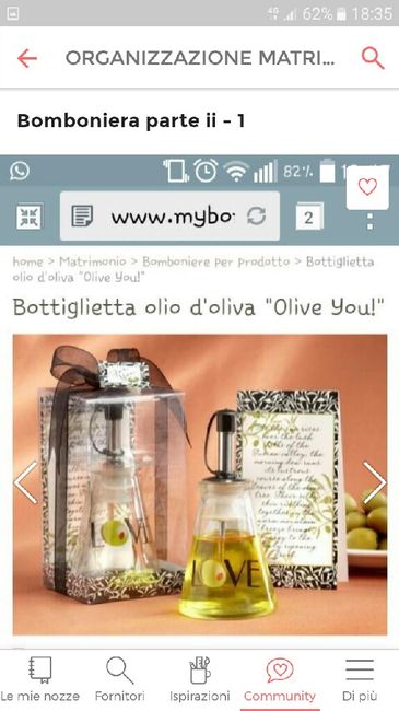 Ciao a tutte carissime, volevo chiedervi se qualcuna di voi ha acquistato online delle bomboniere alimentari (a me piacerebbe regalare dell'olio buono ad esempio). Ho trovato alcuni siti internet ma se qualcuna ha già acqusitato online e si è trovata...