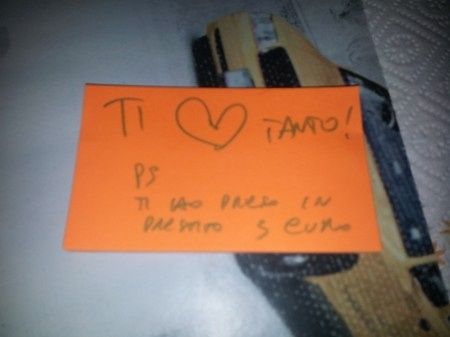 Ciao ragazze stamattina fm mi ha strappato un sorriso... mi ha lasciato un messaggio sulla tavola che dice "ti ho preso in prestito 5 euro" . Mi fa sorridere perchè abbiamo il conto in comune quindi quei 5 euro sono anche i suoi!!!