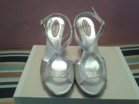 Eccole dopo tanti giri le ho trovate.. mi piacciono molto nn sn proprio bianche anzi veramente sono satinate grigio con Swarovski e sn della marca melluso pagate 139 euro.. sn abbastanza comode ci cammino abbastanza bene.. cercherò di portale a casa...