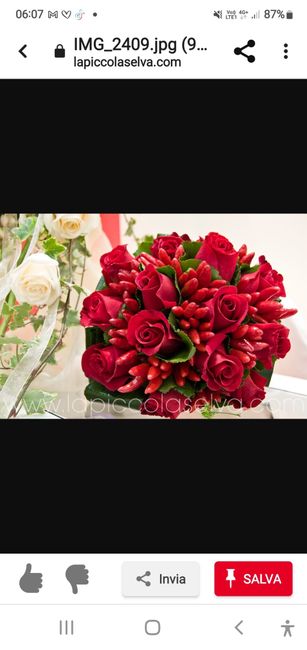 Ciao sposine/I ho scelto di avere un bouquet di rose rosse e peperoncino ma sono indecisa sw farlo tutto rosso oppure aggiungere qualche tocco di bianco non ho trovato esattamente la foto che volevo mostrarvi ma il tocco bianco lo darei con la...