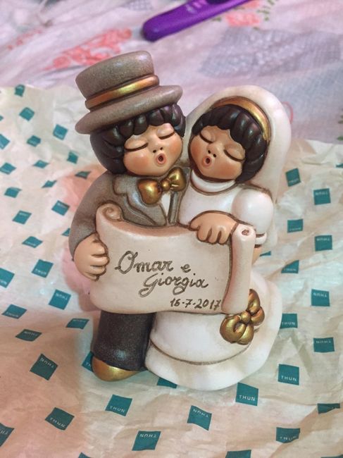 Appena ritirate le mie bomboniere .. Che sono gli sposini della Thun in moto e questo è il cake topper che mi hanno regalato sulle bomboniere .. È così dolce .. Vi piace ? Voi cosa avete scelto