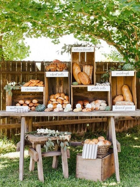 Mi piacerebbe suddividere i tavoli secondo il tema cucina..con dolci e cioccolato però è già stato fatto da amici. Allora frutti, ma d'estate andranno a male .. Allora pensavo al pane! Ogni tavolo avrà un pane speciale (es sesamo/olive/peperoncino)...
