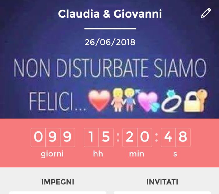 Buongiorno..... Oh my God.....il countdown segna -99 gg 😍😍😍 che emozione mista ad ansia di nn riuscire a fare tt....xke organizzo l evento a distanza!!!! Ad aprile ho prima prova trucco e parrucco, ulteriore prova abito e abbiamo il pranzo di prova...