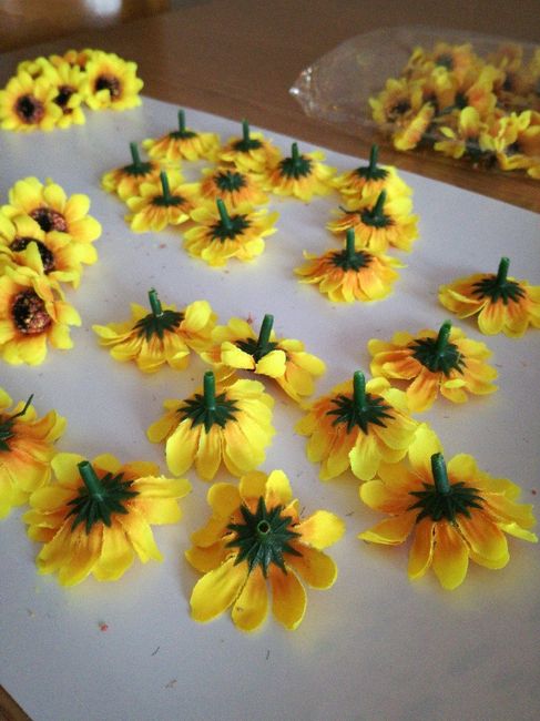 Ciao brides.... Ho comprato su internet qst mini girasoli,x addobbare il ns tableau...i segnatavoli....i nomi della confettata ecc ma come potete vedere dalla foto...nn.Tutti sono belli dritti...alcuni petali sono chiudi...piegati....cs suggerite x...