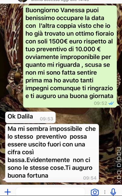 Un fioraio conosciuto tramite l’applicazione mi ha fatto un preventivo di 11.oooo euro cosa che io riTengo no assurdo molto di più .... confrontando lo stesso preventivo con altri fiorai c’erano ben 9.500 euro di differenza non appena ho espresso la...