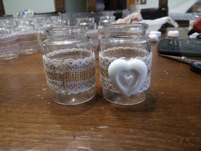 Work in progress delle bomboniere, vasetti 2 tipi allestiti diversamente, poi di seguito metteremo cartellini cn spago, confetti, tappi in sughero, fiocco. Poi ci saranno anche le provette che per ora non ho ancora iniziato. Boboniera 1Bomboniera 2 ...