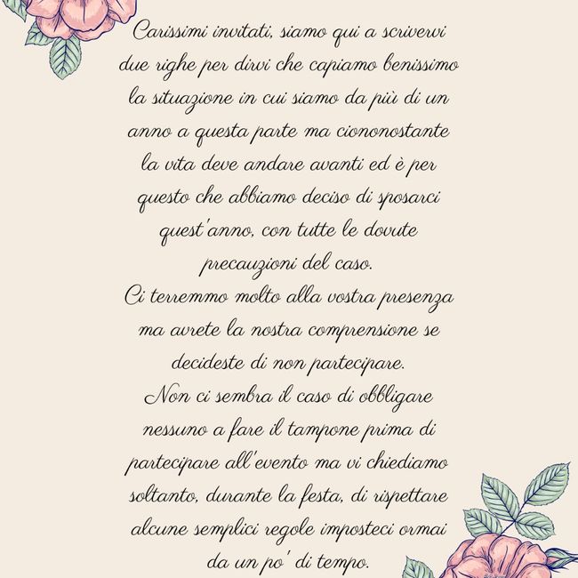 Buongiorno ragazze, sto pensando di inserire nella partecipazione di nozze una lettera scritta da me, ma vorrei un consiglio da voi. Data la situazione di emergenza in cui ci troviamo, e vuoi o non vuoi, che continueremo a trovarci per molto altro...