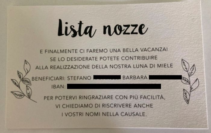 Ciao sposine❤ Noi vorremmo mettere l'Iban dell'agenzia di viaggio sulle partecipazioni, per contribuire alla nostra luna di miele, ma non abbiamo proprio idea di cosa scrivere 😬😅 mi consigliate qualcosa? Grazie mille ❤😘🥰