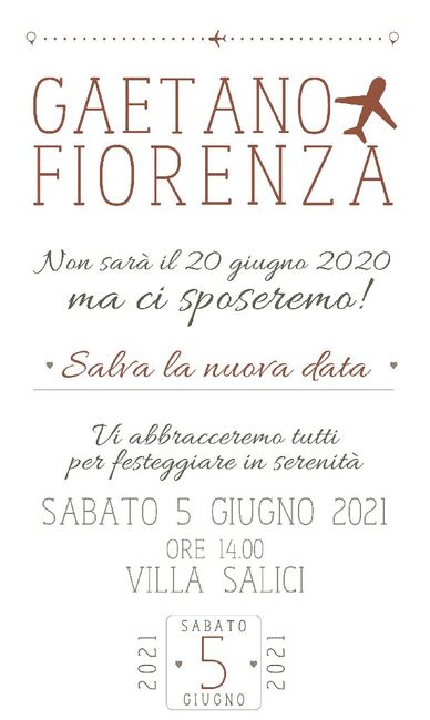 Ciao ragazze, Stiamo pensando di spostare il nostro matrimonio, non siamo ancora sicuri ( in me ce tanta ancora di quella speranza 😢) Pero vorrei portarmi avanti se nel caso cmq dovremmo farlo. Cosa avete scritto nel vostro change the date o...
