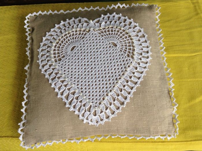 Ecco il mio cuscinetto portafedi in stile country cucito dalla mia futura suocera...lino, uncinetto e perline bianche...mancano solo i nastrini!!! Che ne dite?